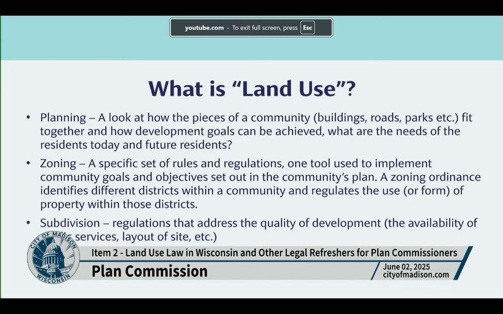 2025-12-01: The Madison Plan Commission held a virtual meeting approving significant “Housing Forward” reforms to Transit-Oriented Development districts, including allowing fourplexes by right and banning standalone parking lots and car washes. They also approved a controversial 320-unit microapartment building downtown with no parking after months of delay, along with several major housing projects including a 118-unit student apartment complex at 450 W Gilman Street and a 42-unit apartment conversion at 501 N Whitney Way.