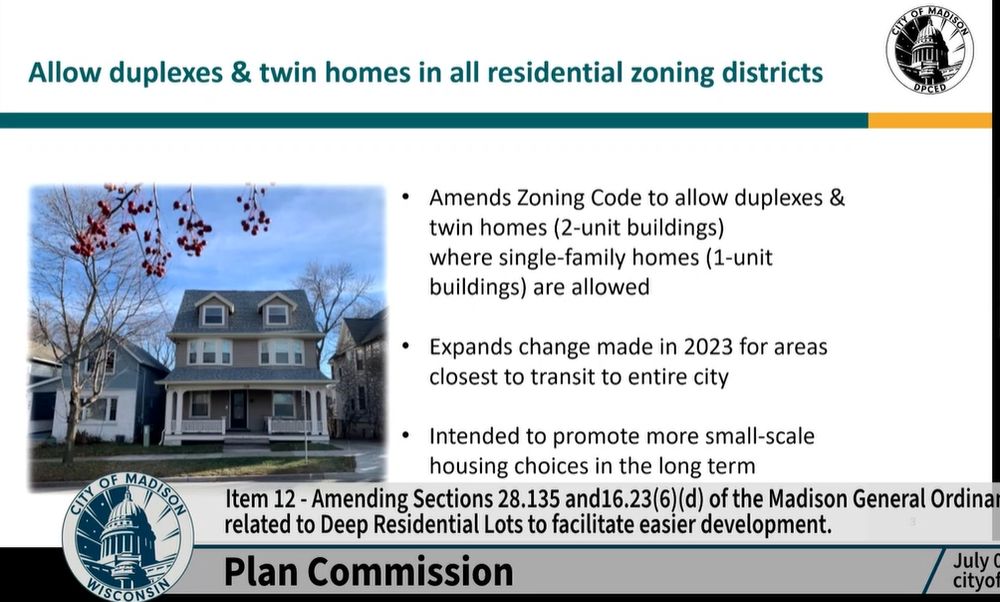 2025-11-03: The Madison Plan Commission held a virtual meeting with extended debate over a controversial 320-unit microapartment building downtown that raised significant concerns about loading zone congestion and management, ultimately resulting in a referral for additional planning. They also recommended changing the name of the southern portion of Ruskin Street to Huxley Street, and approved a conditional use permit for two 2-unit buildings to be constructed in the backyard of two 3-unit buildings at 511 W Dayton Street.