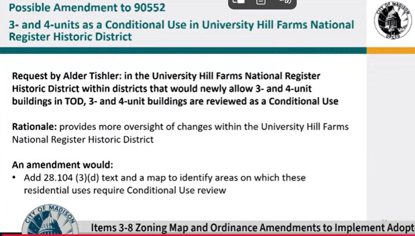 University Hill Farms Controversy: The only public speaker argued that allowing four units by right in University Hill Farms would harm the historic district. Alder Tishler proposed an amendment requiring conditional use review specifically for University Hill Farms, describing it as “one of the last of the planned communities in America…after 1948” and praising how it was “designed right.”