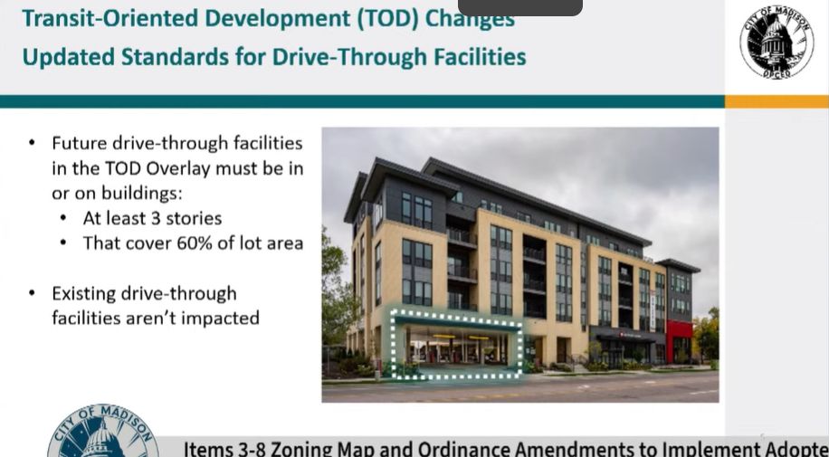 Further discussion occurred regarding the Consideration of a conditional use in the Commercial Corridor-Transitional (CC-T) District and Transit-Oriented Development (TOD) Overlay District for a drive-through window to allow construction a coffee shop with drive-through window (legistar 86523). The proposed coffee shop, which would be located at 3915 Lien Road in District 3, aims to offer two drive through lanes, as well as a walk-up window option for pedestrians. City Staff believe the conditional use conditions have been met, as there is ample, safe space for pedestrian use and cyclists would be able to use the lanes just as a vehicle would. The only notable concerns brought to the commission were grading surrounding the build site, as the flat is lower than the neighboring streets of East Washington Avenue and Lein Road.