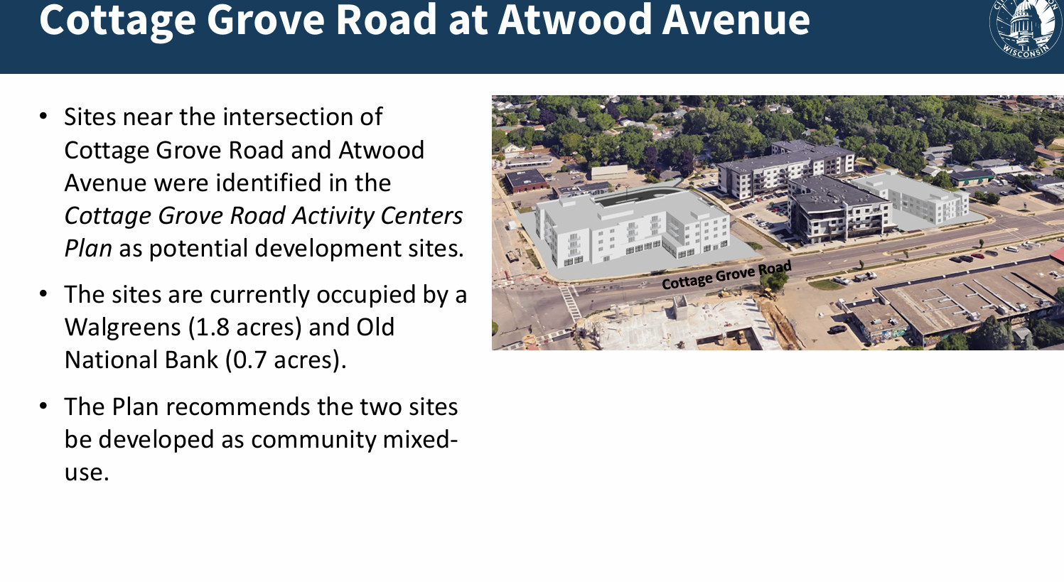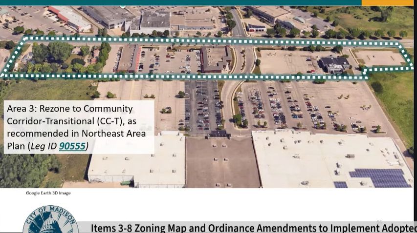 - Conditional use at 6702 Odana Road in District 19 in a Commercial Center (CC) District for dwelling units in a four-story mixed-use building with approximately 1,973 square feet of commercial space and 60 apartments Legistar 87141.
