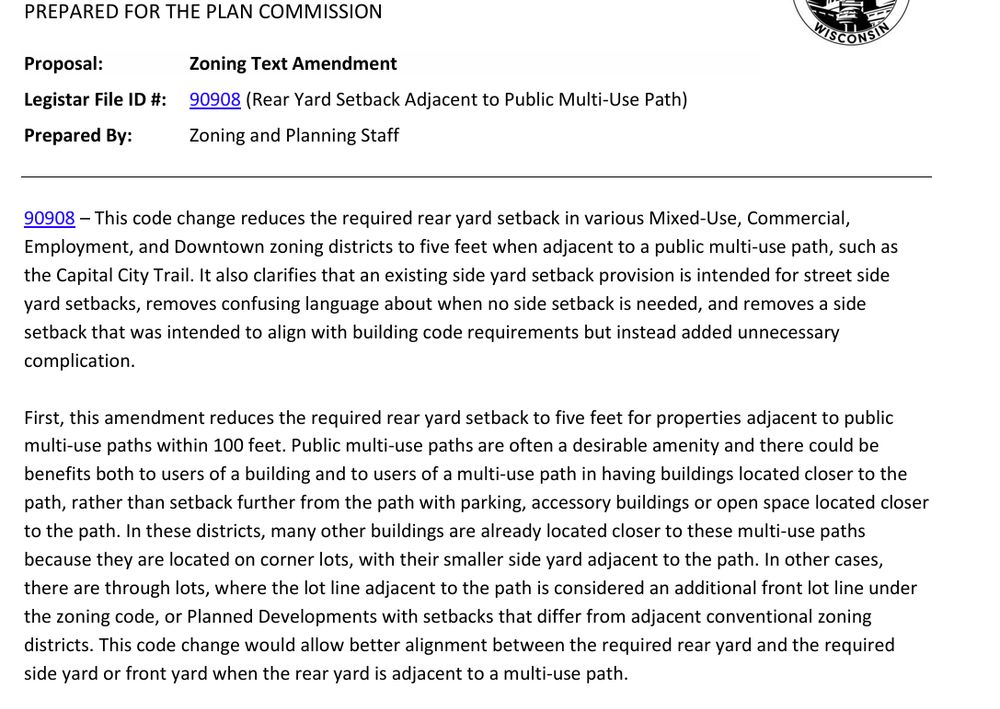 The Commission approved reducing rear setbacks to 5 feet for properties in mixed-use, employment, and downtown zoning districts near the Capital City Trail. Staff hopes this will allow for greater activation of trail space.