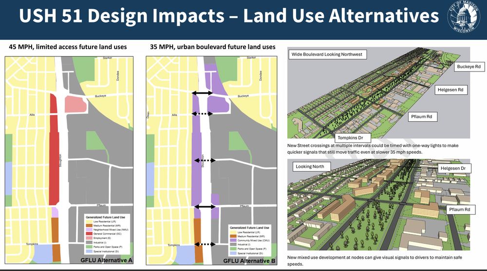 Highway 51 Planning: Much of the plan depends on whether WisDOT allows boulevard treatment for US Highway 51, which would enable more pedestrian-friendly development along the corridor. The city plans to create a plan for Highway 51 assuming the current 45 mph limited-access design, but wants to illustrate what a more urban option would look like and be prepared if WisDOT chooses that approach for Highway 51 reconstruction.