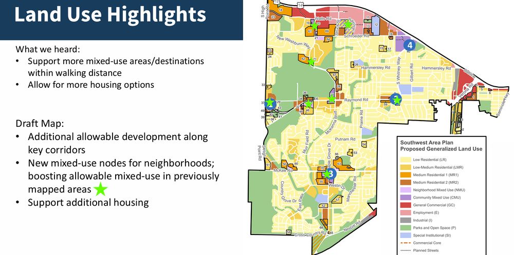 The new MR1 land use category features prominently in the Southwest plan to allow more mixed-use development. The plan proposes possible Schroeder Road realignment along with other bike and pedestrian improvements.