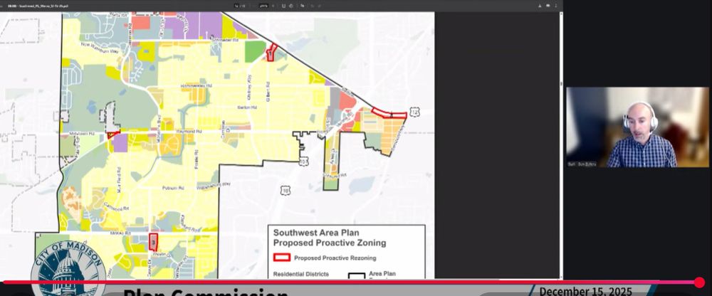 2025-12-15: The Madison Plan Commission held a virtual meeting focusing on presentations of the Southwest and Southeast Area Plan drafts, while also approving several development projects and zoning modifications. They approved reducing rear setbacks near the Capital City Trail, increased density for a small apartment building on Blount Street, approved a CSM for a large 241-unit development on Commercial Avenue, and discussed significant area plan proposals including new MR1 land use category and proactive rezonings to limit residential uses in certain areas.