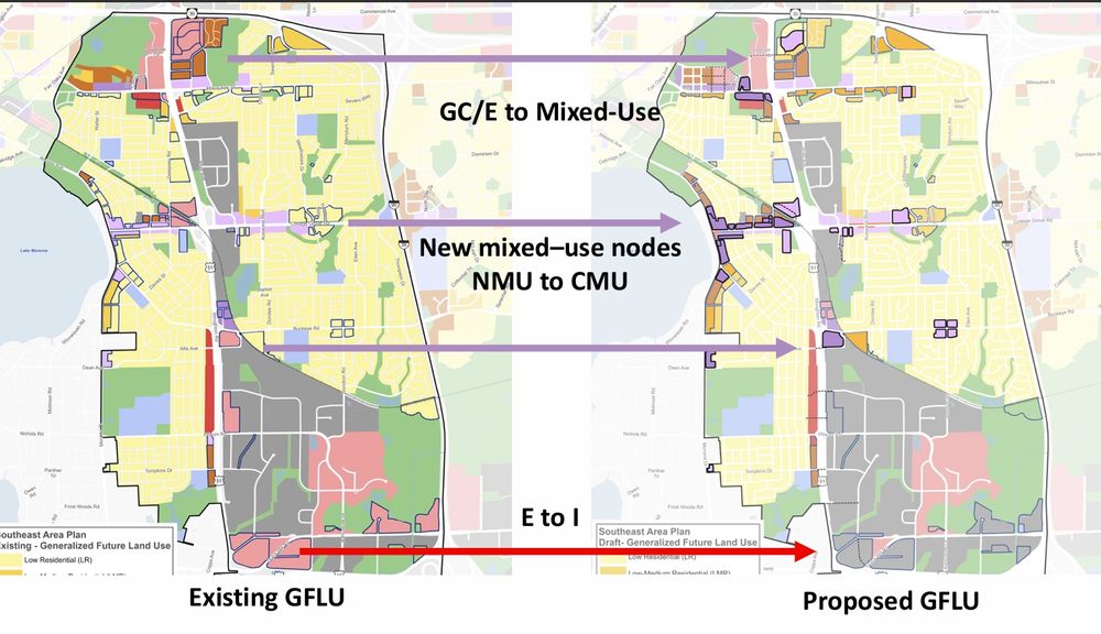 Employment and Industrial Preservation: Staff expressed concern about residential uses crowding out employment and industrial uses in the southeast area, wanting to preserve those land uses in certain plan areas.