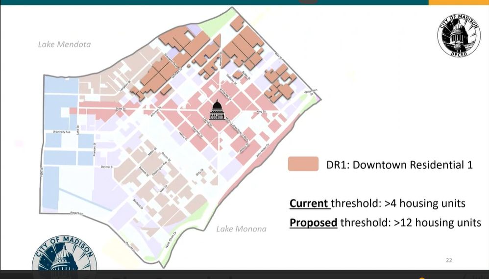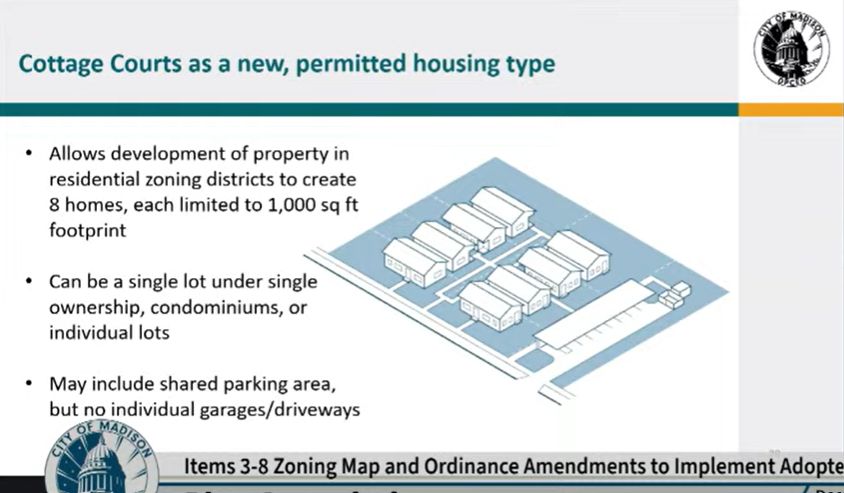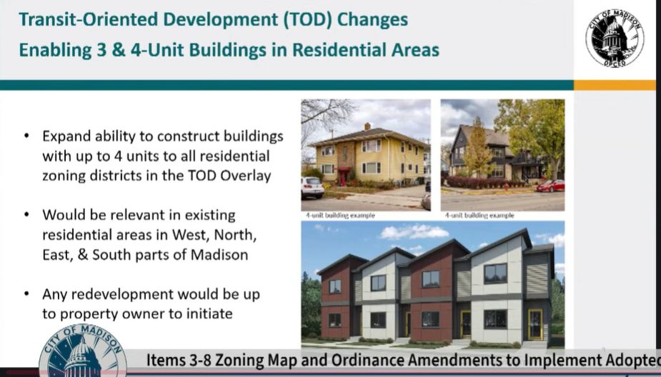 2025-12-01: The Madison Plan Commission held a virtual meeting approving significant “Housing Forward” reforms to Transit-Oriented Development districts, including allowing fourplexes by right and banning standalone parking lots and car washes. They also approved a controversial 320-unit microapartment building downtown with no parking after months of delay, along with several major housing projects including a 118-unit student apartment complex at 450 W Gilman Street and a 42-unit apartment conversion at 501 N Whitney Way.