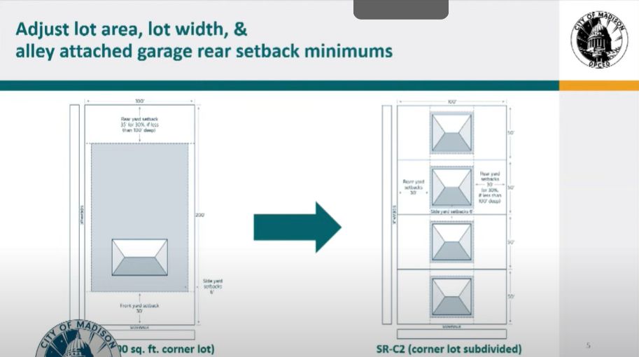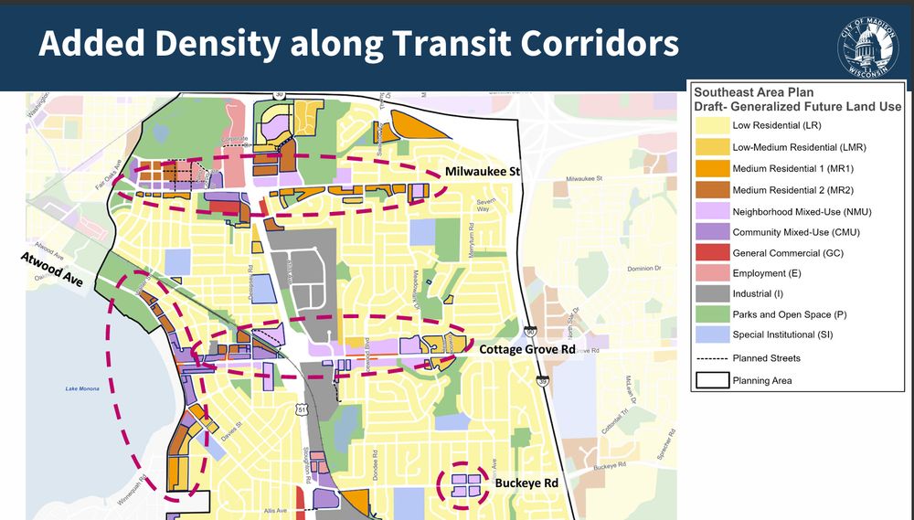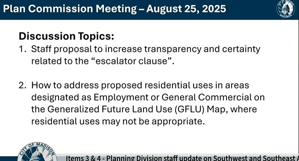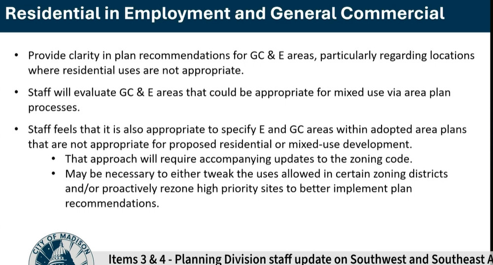 2025-12-15: The Madison Plan Commission held a virtual meeting focusing on presentations of the Southwest and Southeast Area Plan drafts, while also approving several development projects and zoning modifications. They approved reducing rear setbacks near the Capital City Trail, increased density for a small apartment building on Blount Street, approved a CSM for a large 241-unit development on Commercial Avenue, and discussed significant area plan proposals including new MR1 land use category and proactive rezonings to limit residential uses in certain areas.