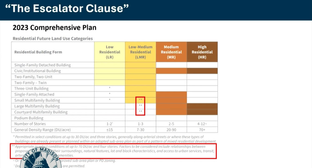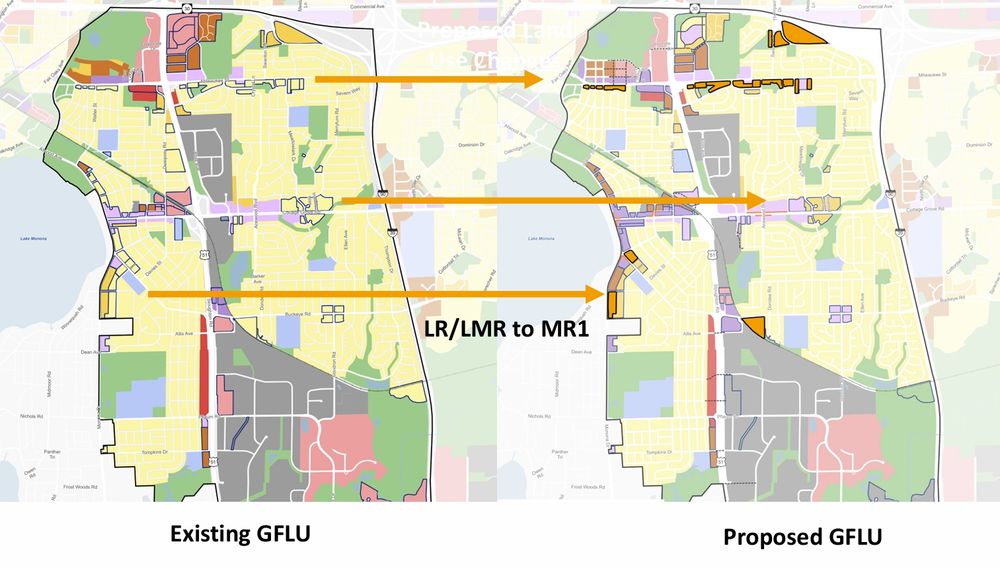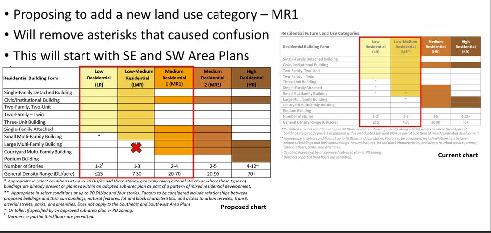 New Land Use Category: Staff proposed adding MR1 (Medium Residential 1), a new category between Low-Medium Residential (LMR) and Medium Residential (MR), while also eliminating density increase possibilities in some LMR areas. There was implicit concern that having different land use categories across different area plans could create confusion.