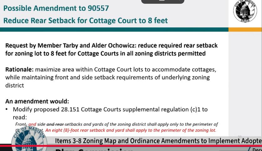 The Commission approved reducing rear setbacks to 5 feet for properties in mixed-use, employment, and downtown zoning districts near the Capital City Trail. Staff hopes this will allow for greater activation of trail space.