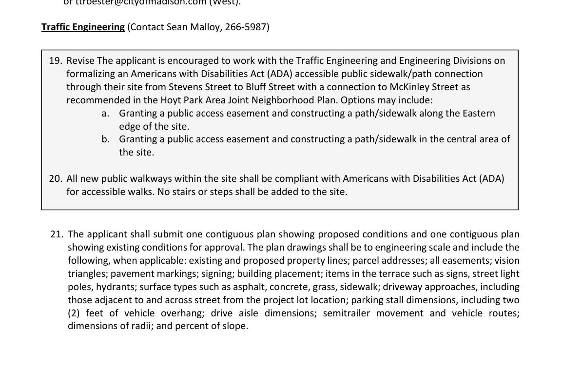 Subsequently, Alder Field requested more information regarding accessibility. Malena Olivera, a representative in attendance on behalf of the developers, Plaza Street Partners, provided clarification on how they are currently looking to how to add additional access points that will be both handi-capable and ADA compliant, depending on how many they can add and where they will be able to get approval for the access points’ locations while taking into consideration the grade and safety of existing retaining walls. Alder Field also inquired as to whether or not the Plan Commission could request additional signage requirements in order to make access points easier to locate and navigate. City Staff member Parks clarified they cannot control signage, but they could advise and/or advocate for additional postings. Field made a motion to request language on signage to be added, to which Commissioner Tuttle weighed in and the Plan Commission was agreeable with. Ultimately, the request was approved before moving on to the next topic of the evening.