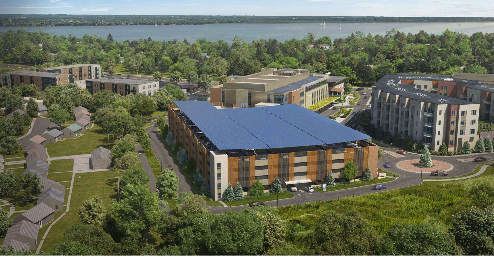 Planning Context: The parking structure is part of a transit-oriented development (TOD) at UW Health’s new 750 University Row clinic. Stand-alone parking structures are not normally permitted in TODs, and the original approval had included a number of mitigations to justify the exception. Solar panels were among those mitigations.
